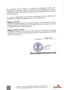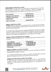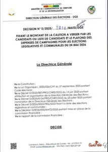 La Direction générale des élections (DGE) a publié les montants des cautions requises pour les candidats et le plafond des dépenses de campagne pour les élections législatives et communales du 24 mai 2026. Cette décision, signée par la Directrice générale des élections, Mme Djenabou Touré, est fondée sur la Constitution, le Code électoral et plusieurs décrets relatifs à l’organisation du scrutin. Elle définit ainsi les modalités financières encadrant la participation à ces élections.