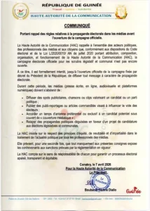 La Haute Autorité de la Communication (HAC) a rappelé à l’ordre les acteurs politiques et les médias en interdisant toute forme de propagande avant l’ouverture officielle de la campagne électorale. Dans un communiqué rendu public ce mardi 7 Avril 2026 , l’institution en charge de régulation des médias en République de Guinée insiste sur le respect strict du calendrier établi afin de garantir l’équité entre les candidats et préserver la crédibilité du processus électoral.
